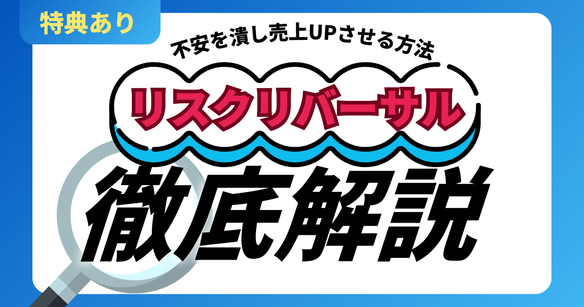 マーケティングのリスクリバーサルとは?不安を潰し売上UPさせる方法の記事で紹介した「リスクリバーサルの具体的な事例と対策を全てまとめた資料になります。
